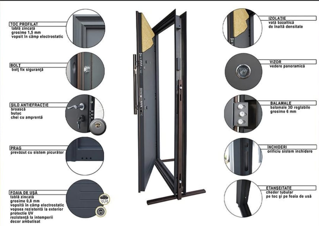 Construcția solidă, izolarea termică și fonică, durabilitatea în condiții extreme și finisajele sunt elementele care definesc fiecare ușă produsă. De la tablă zincată ambutisată și vopsire în câmp electrostatic cu pulberi rezistente la radiații UV, până la izolația cu vată bazaltică de înaltă densitate și etanșarea realizată cu garnituri suedeze de top — fiecare componentă este aleasă pentru performanță și eleganță.